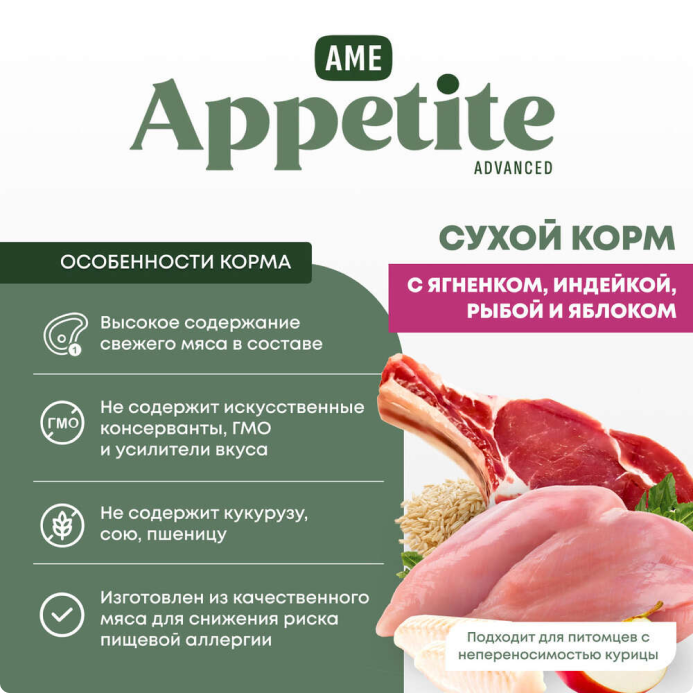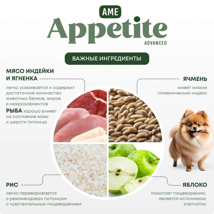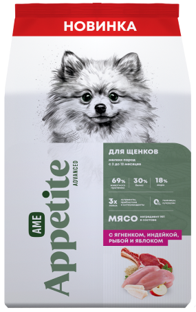 AmeAppetite Advanced сухой корм с ягненком, индейкой, рыбой и яблоком для щенков мелких пород с 2 до 12 месяцев
