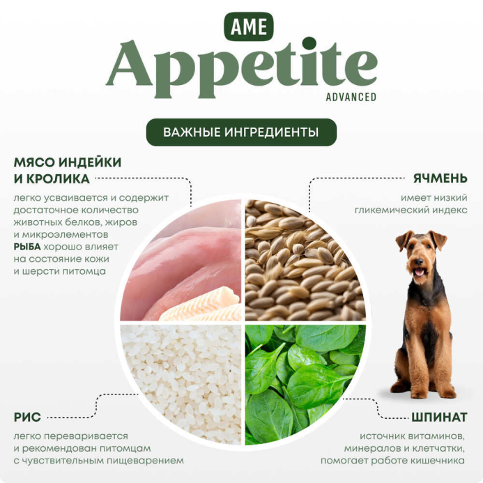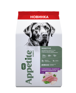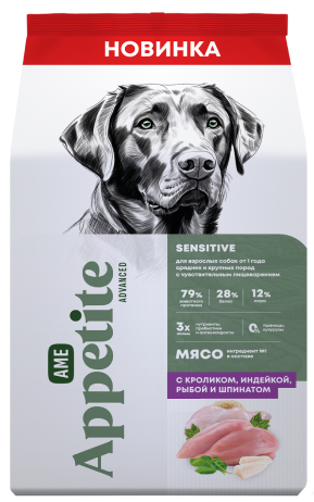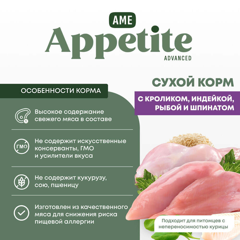 AmeAppetite Advanced сухой корм с кроликом, индейкой, рыбой и шпинатом для взрослых собак от 1 года средних и крупных пород с чувствительным пищеварением