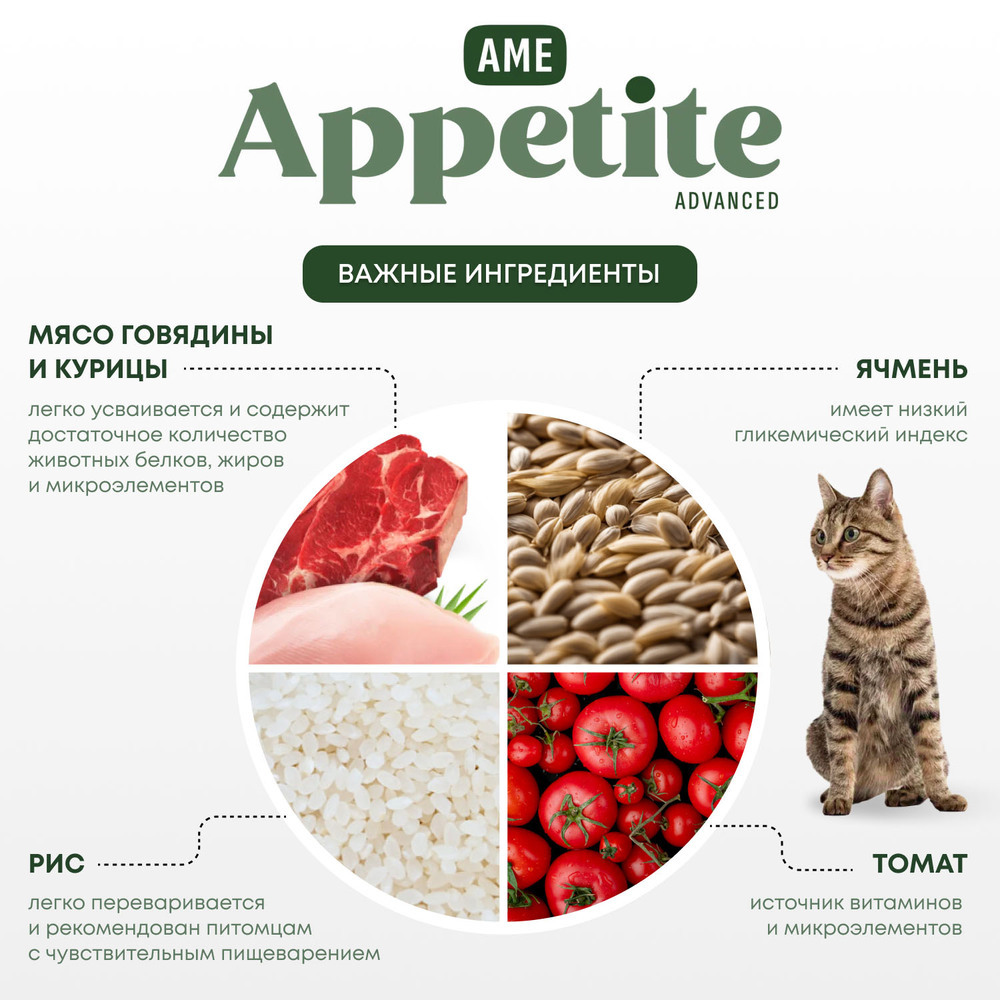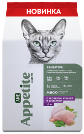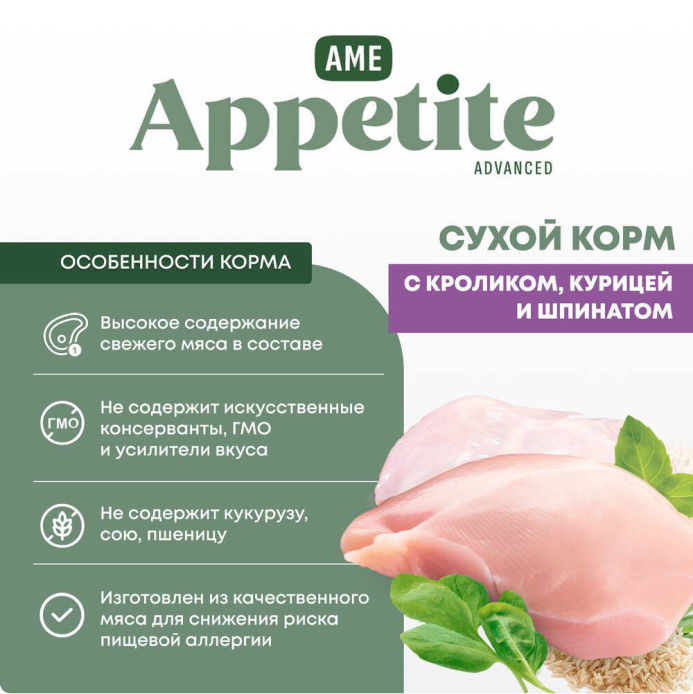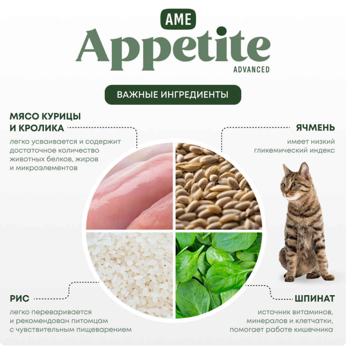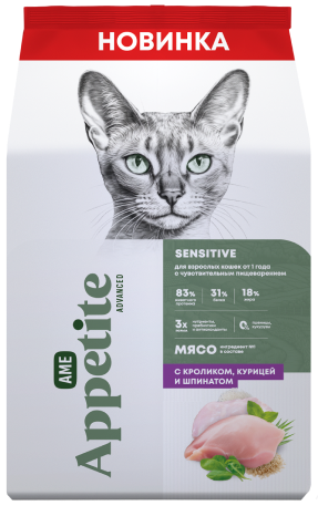 AmeAppetite Advanced сухой корм с кроликом, курицей и шпинатом для взрослых кошек от 1 года с чувствительным пищеварением