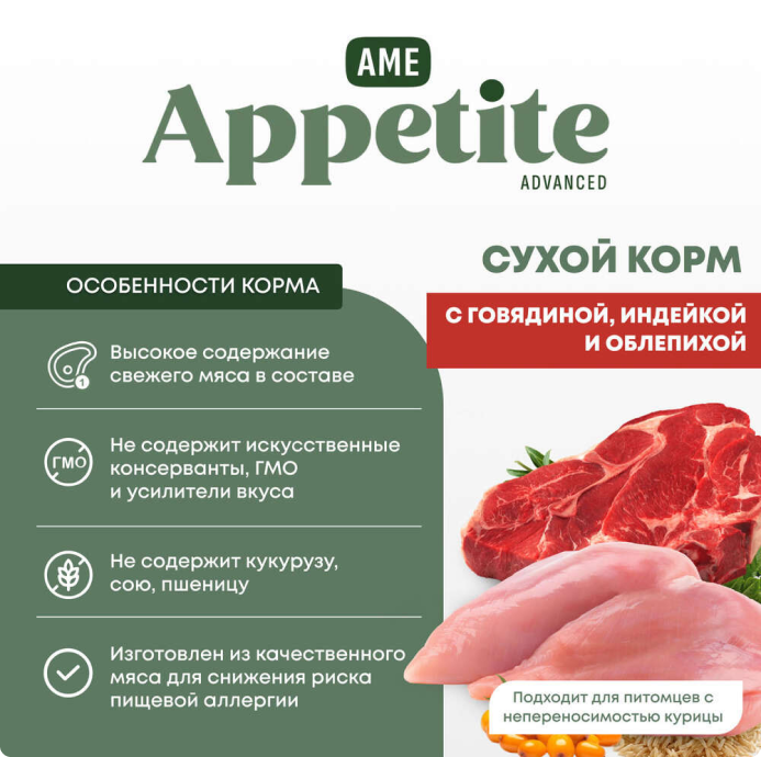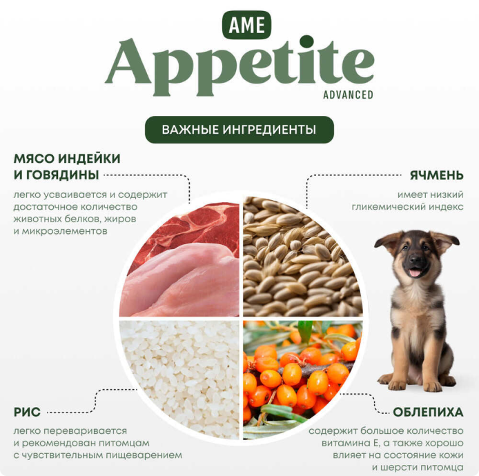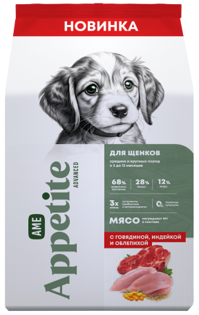 AmeAppetite Advanced сухой корм с говядиной, индейкой и облепихой для щенков средних и крупных пород с 2 до 12 месяцев